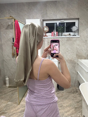 Extra-lange, weiche Haube nimmt voluminöse Locken, Dreads oder Zöpfe auf. Kein Quetschen, keine Knicke — ideal für Frauen mit viel Haar und Nachtpflege.