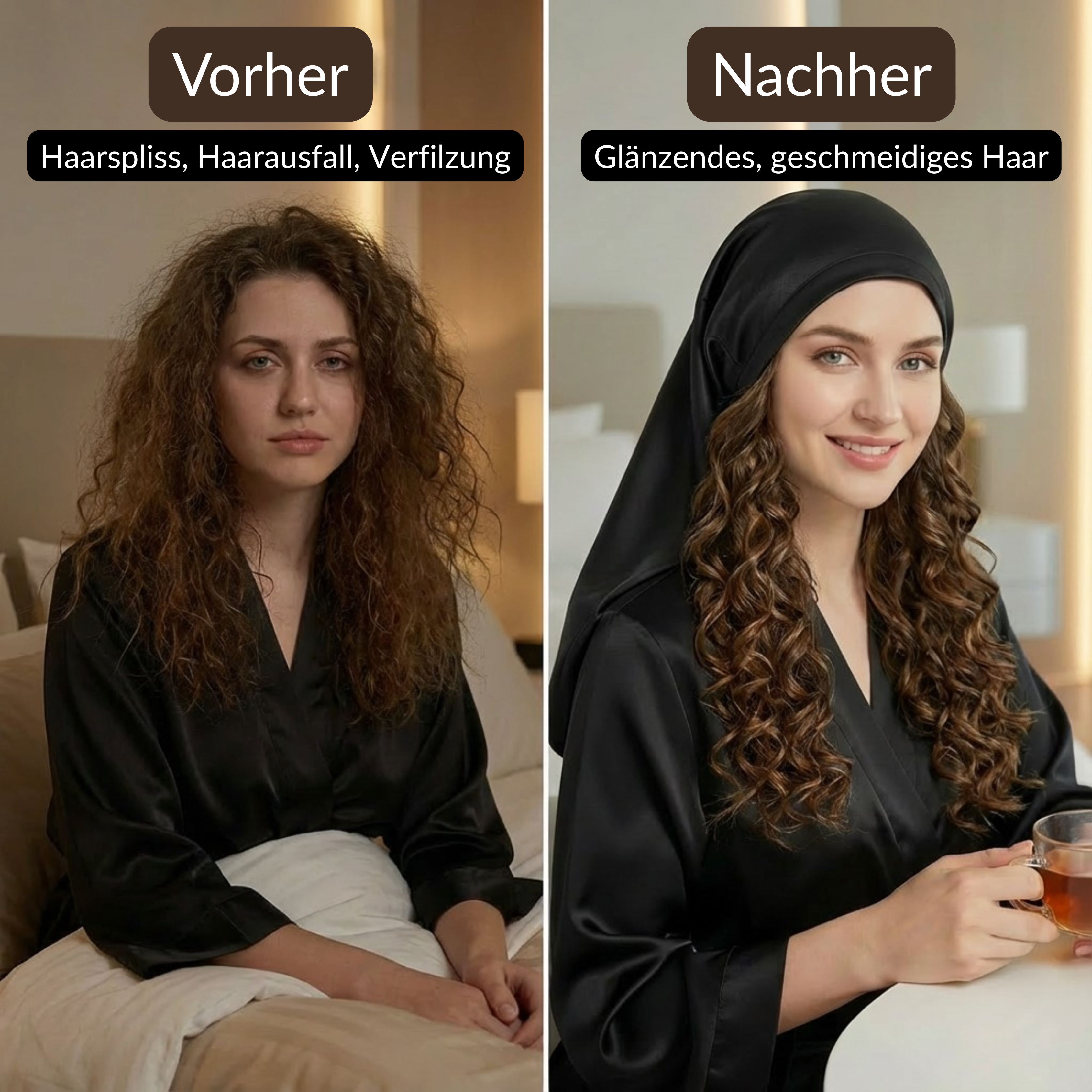 Seide reduziert Reibung und Feuchtigkeitsverlust, wodurch Haare glatter bleiben und seltener Föhnen oder Hitze nötig ist.